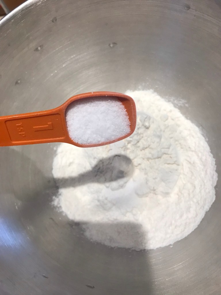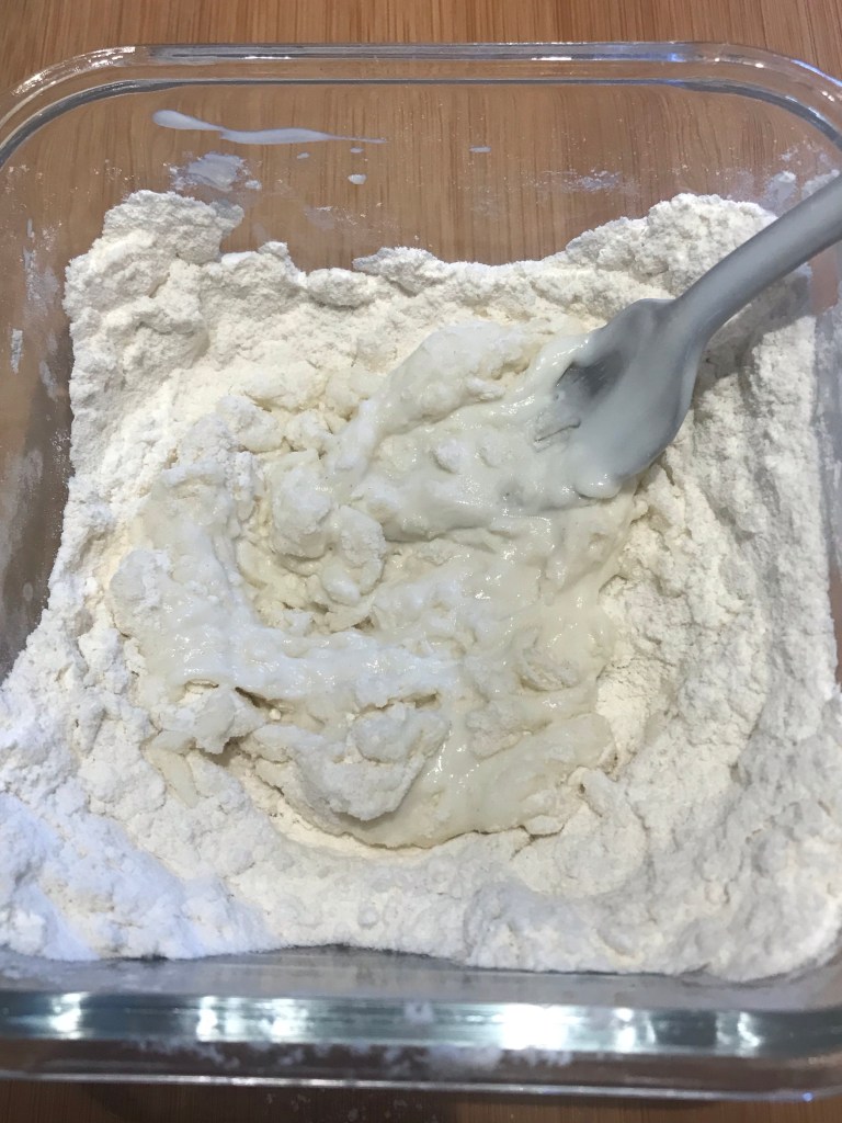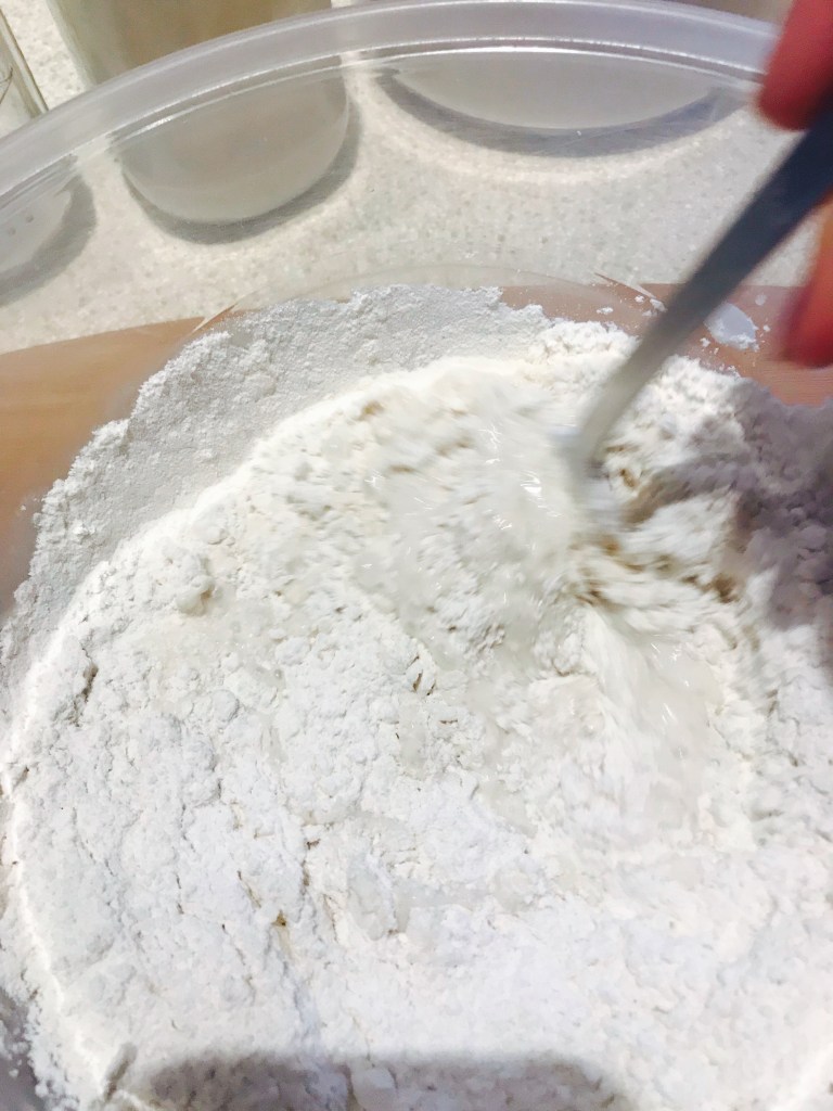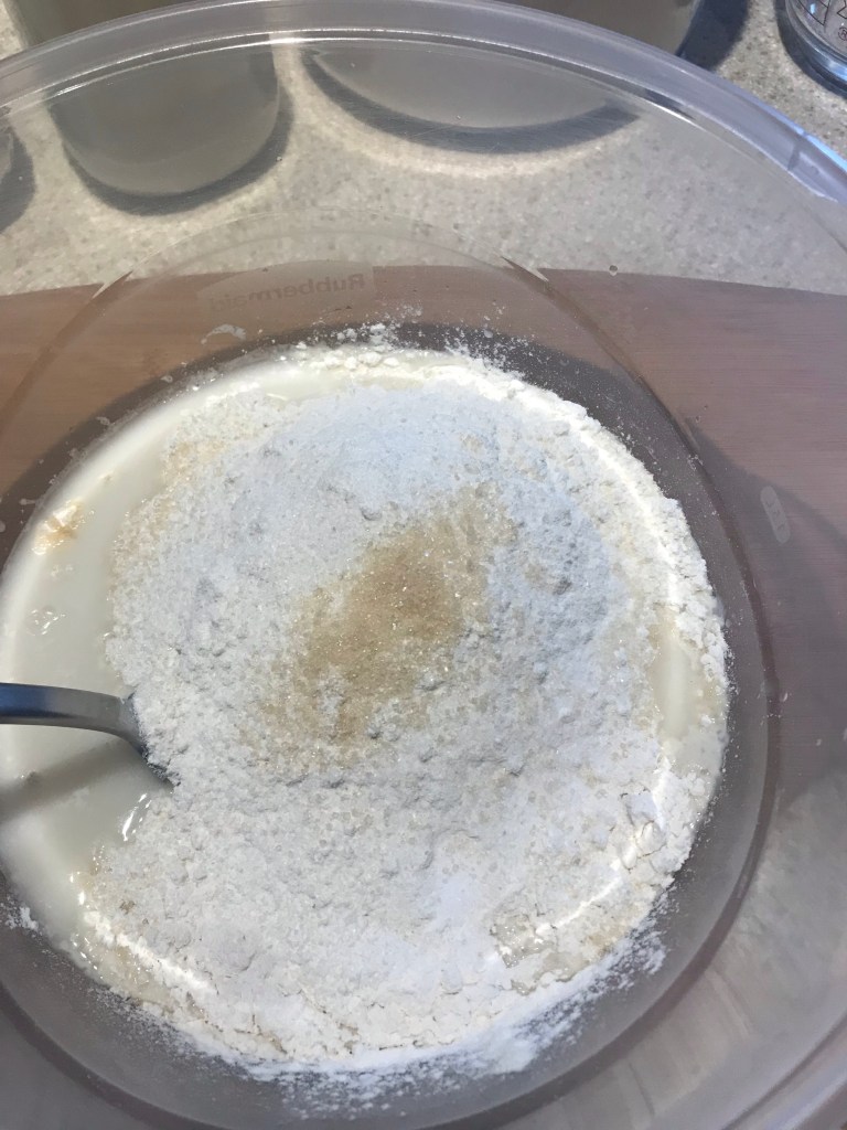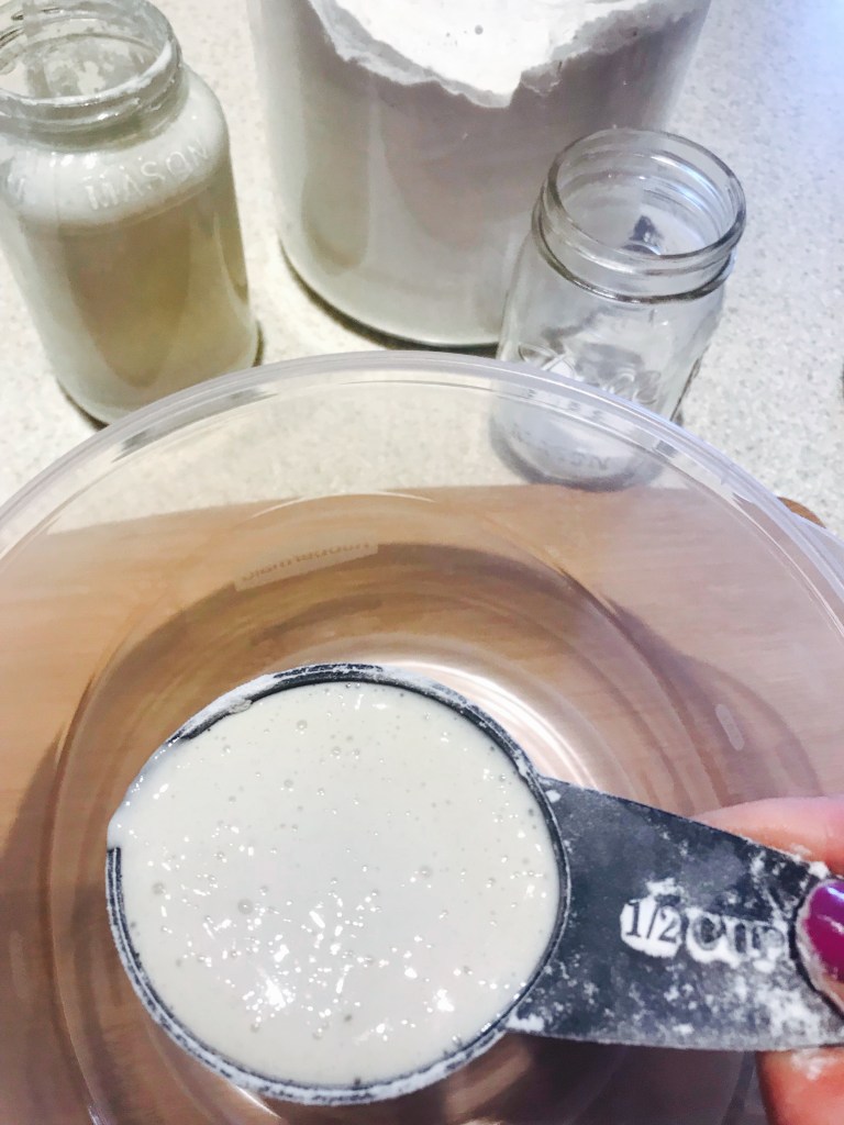 Day one: mix 1/2 c of flour and purified water equal parts. Cover with lid lightly, Leave on counter to begin souring process.