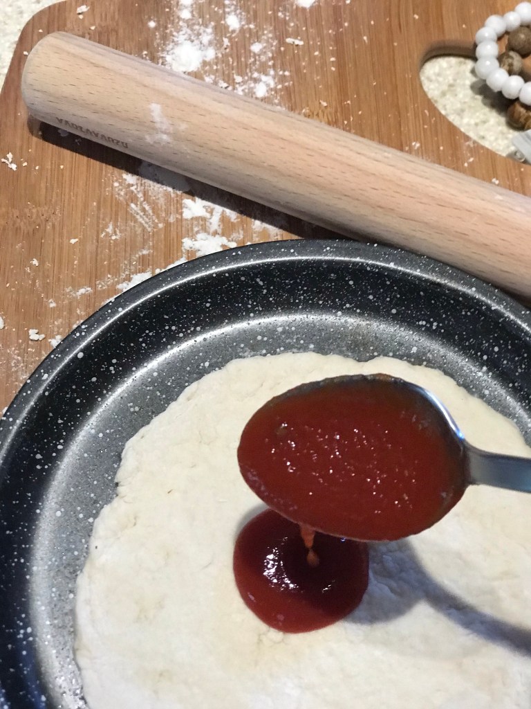 1/2 c baking flour (if you donβt have this, you can add 1/4 tsp salt w 1 tsp baking powder) 1/3 c nonfat yogurt mix together. Form dough into ball. Roll it out onto flour surface into thickness you desire. Add sauce along with cheese and favorite toppings.