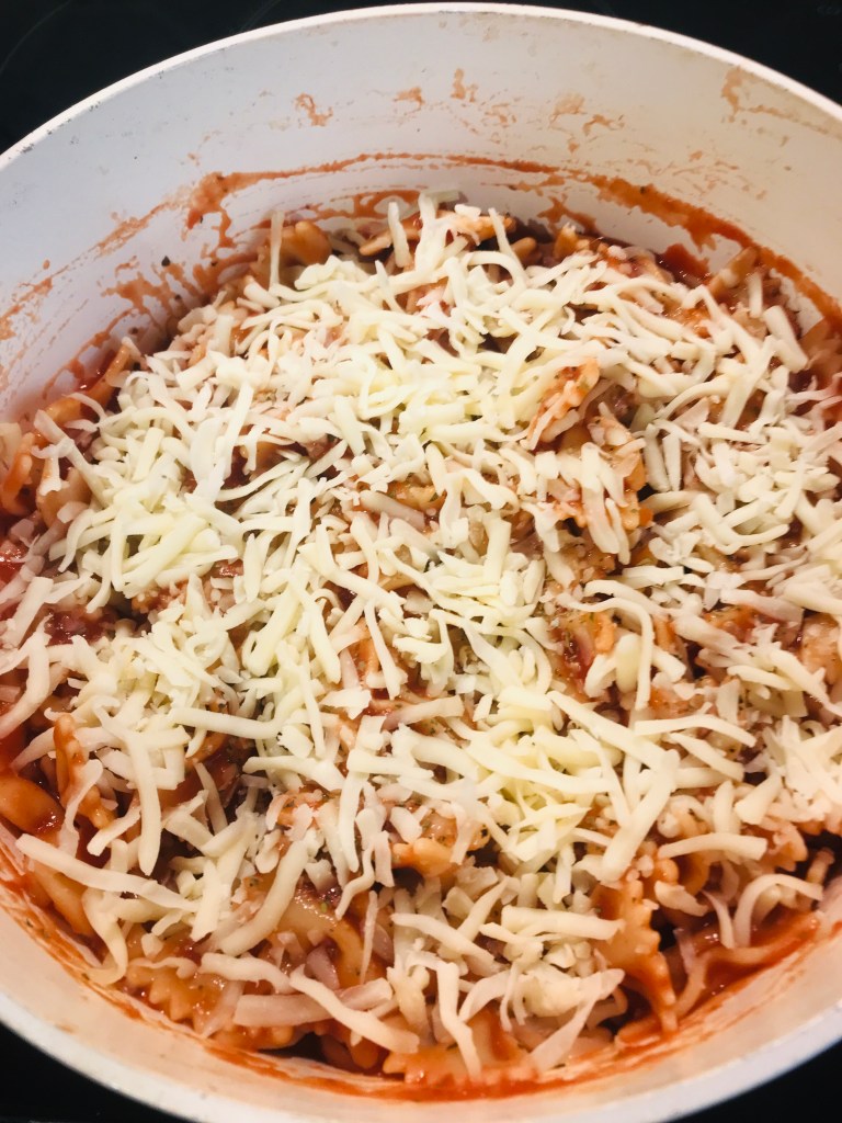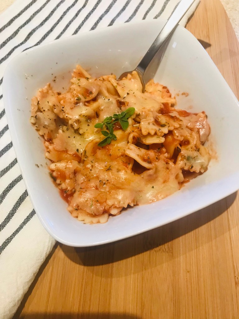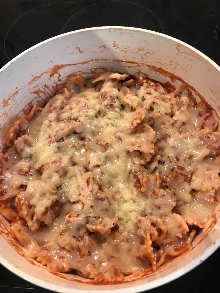 12 oz bow tie pasta 2 16 oz cans tomato sauce or your favorite type of pasta sauce 1/2 c -1 c mozzarella cheese