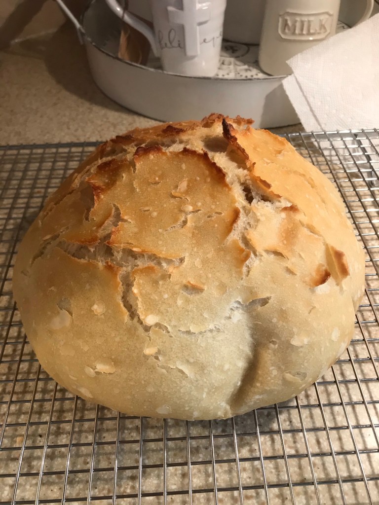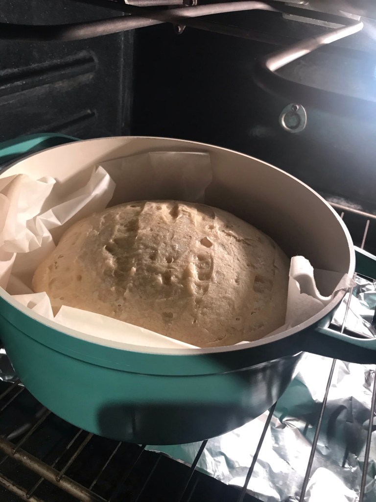 Preheat oven to 400 degrees. Bake in covered Dutch oven. Make slits on top of bread dough before adding to oven. Remove top after 30 min, continue baking for additional 20 min. Remove from oven and cool bread on baking rack.